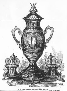 A drawing of the gold and silver cup for the winner of the Telegram Trophy Race dominated the front page of the Sunday Telegram the day after the race. Coverage of the event took up more than two full pages of the newspaper. (Sunday Telegram, May 10, 1896)